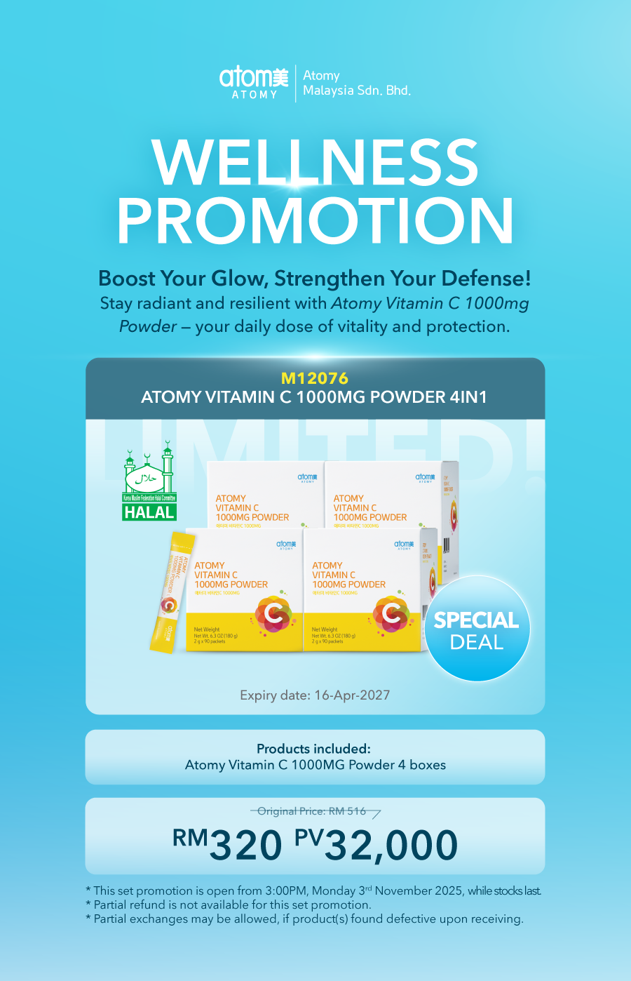 From Friday 10.00 am – Monday 10.00 amKindly provide details below to us via email at atomy_my@atomypark.com